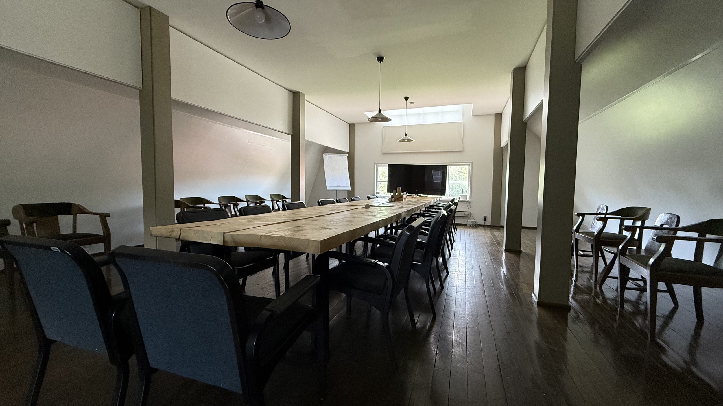 Alakerran kokoustilassa on videotykki, valkoinen seinä ja fläppitaulu. Avonaisessa yläkerrassa on yksi pitkä pöytä noin 25 hengelle ja 55”- näyttö.